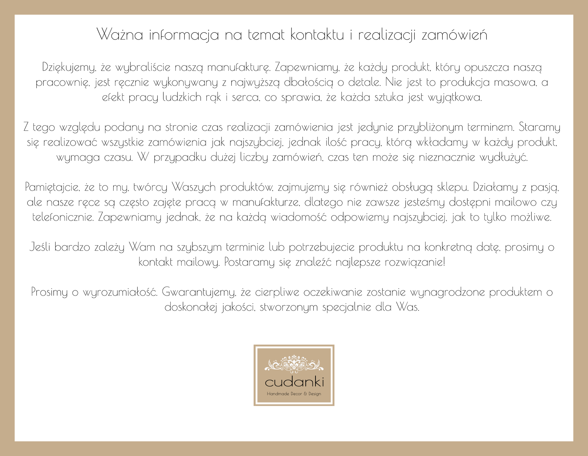 | Czas wykonania zestawu gotowego do wysyłki | Towar wykonywany ręcznie na zamówienie. Zazwyczaj od 10 do około 26 dni roboczych (zwykle bliżej 15) |
