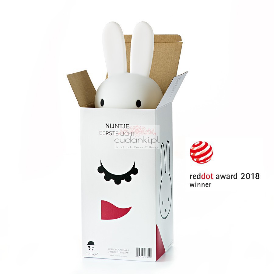 OPISPiękna lampa w kształcie Miffy - mała króliczka, która narodziła się w 1955 roku. . Lampa daje ciepłe, delikatne światło, idealne do stworzenia przytulnego nastroju. Pięknie prezentuje się w każdym wnętrzu. Wyśmienicie sprawdzi się jako designerski dodatek do wystroju każdego wnętrza. Lampy można spotkać w pokojach najbardziej popularnych bohaterów blogów o tematyce dziecięcej, w magazynach dziecięcych i wnętrzarskich. Lampy MrMaria to często pojawiający się element w dekoracji wnętrz również dorosłych. | |