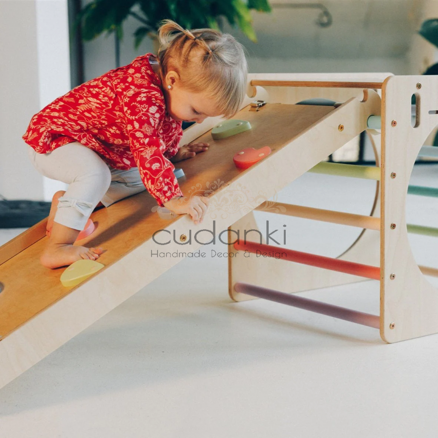 Zestaw Curiosity z kostką Odkrywcy i zjeżdżalnią do wspinaczki daje dzieciom szansę rozwijania wszelkich umiejętności fizycznych odpowiednich dla ich wieku. To skarbnica emocji i niekończącej się zabawy. Kostka aktywności zachęca dzieci do wspinania się, chowania i odkrywania, rozwijając w ten sposób zdolności motoryczne, koordynację i kreatywne myślenie. Wykonany starannie, to nie tylko sześcian, ale portal do magicznego królestwa.